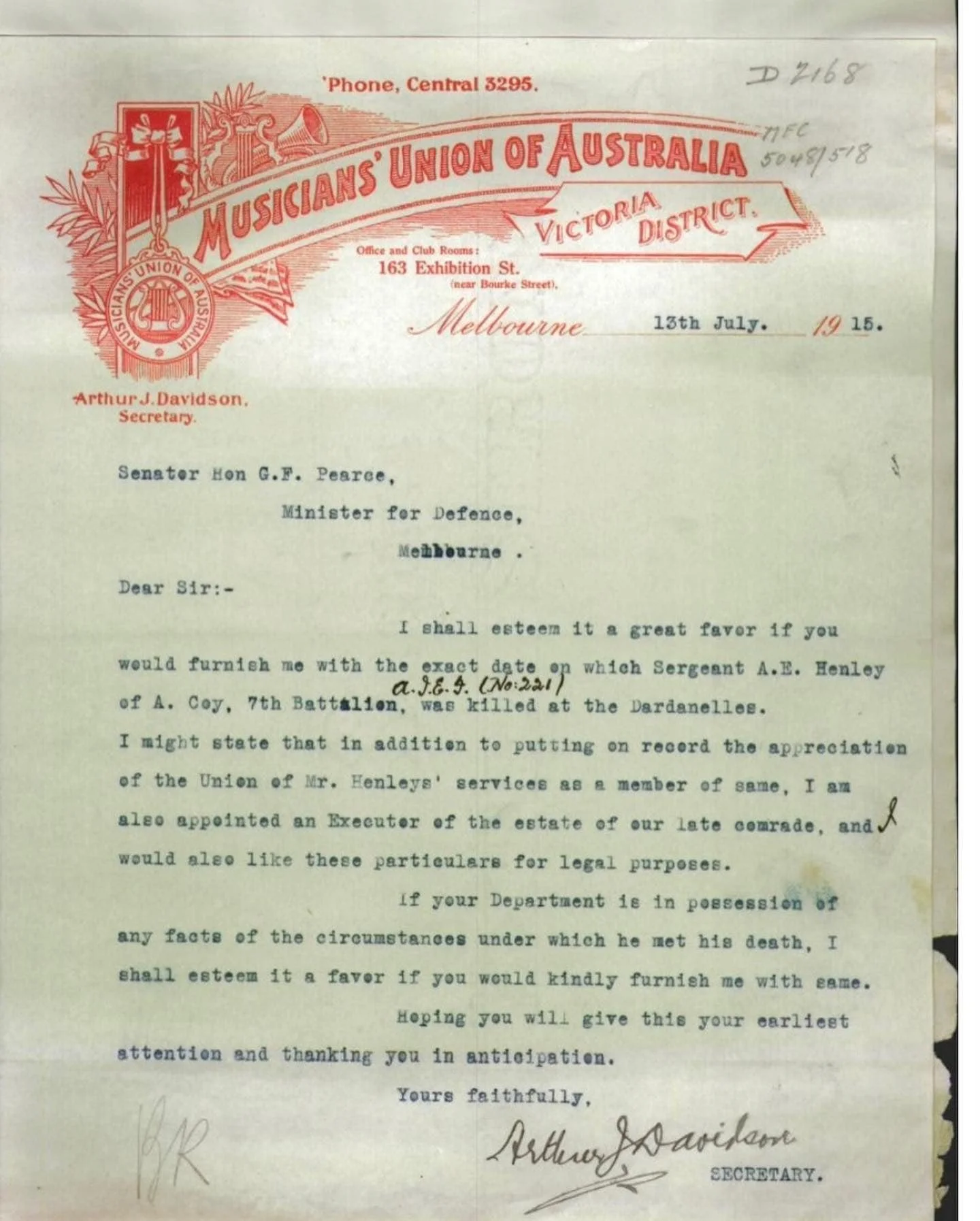 Henley gave his occupation as ‘musician’ and was not referring to his militia stint as reputedly the “best bugler in the Moreton Regiment”. He was an accomplished flautist and lived in Melbourne for some years before the war, playing in the orchestra at the Princess Theatre in accompaniment with the likes of Melba.